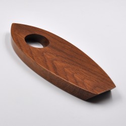 Porta-botellas artesanal fabricado con madera natural de roble teñida en color nogal y con capacidad para una botella de vino. Diseño que imita una tabla de surf. Acabado barnizado.