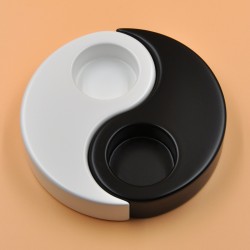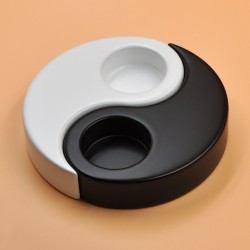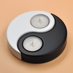 Portavelas con diseño del Yin y yang. Fabricado en tablero de fibras y con acabado lacado.