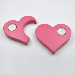 Portavelas fabricado a mano en tablero de fibras. Diseño de dos corazones encajados. Acabado lacado.