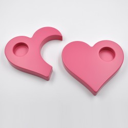 Consta de dos piezas independientes. Una con forma de corazón completo, y otra con forma de corazón con hueco para encajar con la otra.