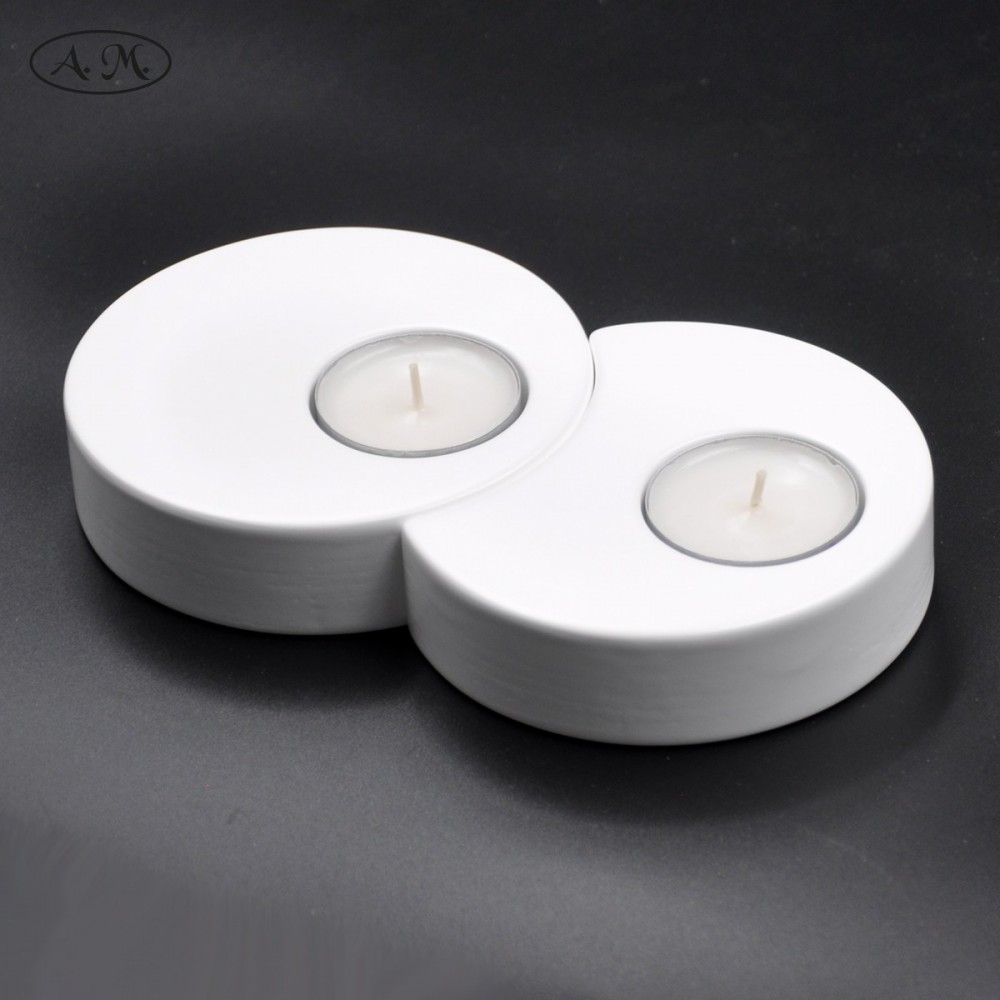 Portavelas con forma de dos círculos encajados, fabricado en tablero de fibras y con acabado lacado.