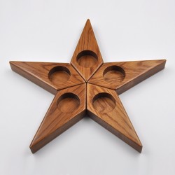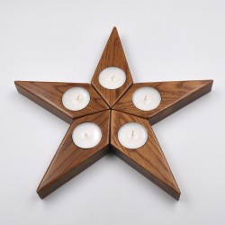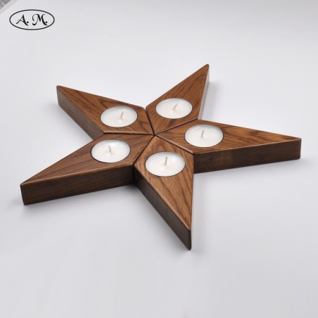 Portavelas fabricado a mano en madera natural de roble teñida en color nogal. Diseño de estrella de 5 puntas. Acabado barnizado.