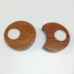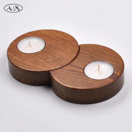 Portavelas fabricado a mano en madera natural de roble teñida en color nogal. Diseño de dos círculos encajados. Acabado barnizado.