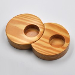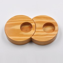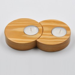 Portavelas fabricado a mano en madera natural de pino. Diseño de dos círculos encajados. Acabado barnizado.