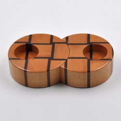Portavelas fabricado a mano en madera natural de haya y mansonia con la veta a testa. Diseño de dos círculos encajados. Acabado barnizado.