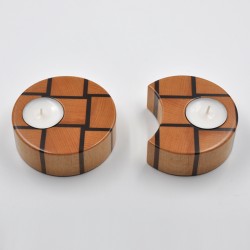 Portavelas con forma de dos círculos encajados, fabricado en madera natural de haya y mansonia con la veta a testa.