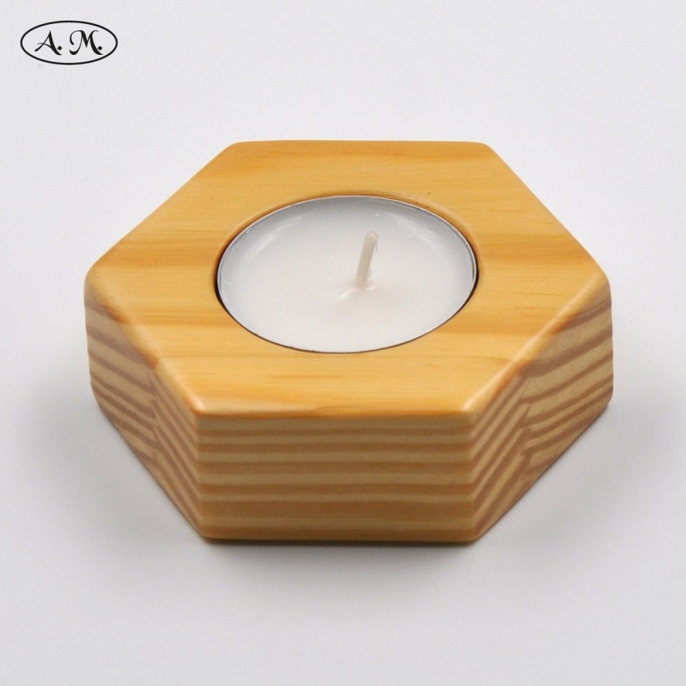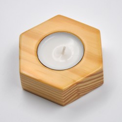 Portavelas con forma de hexágono de 80mm de ancho. Fabricado en madera natural de pino.