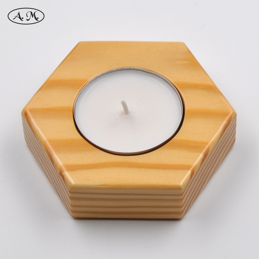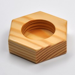 Portavelas con forma de hexágono de 115mm de ancho. Fabricado en madera natural de pino.