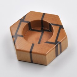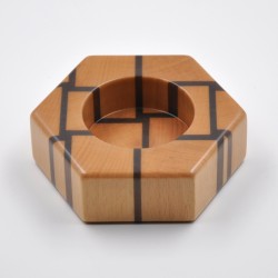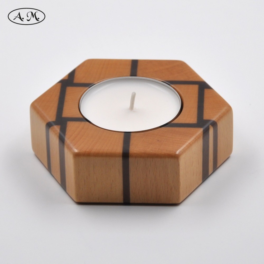 Portavelas con forma de hexágono de 115mm de ancho. Fabricado en madera natural de haya y mansonia con la veta a testa.