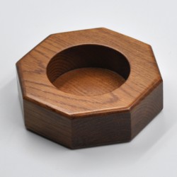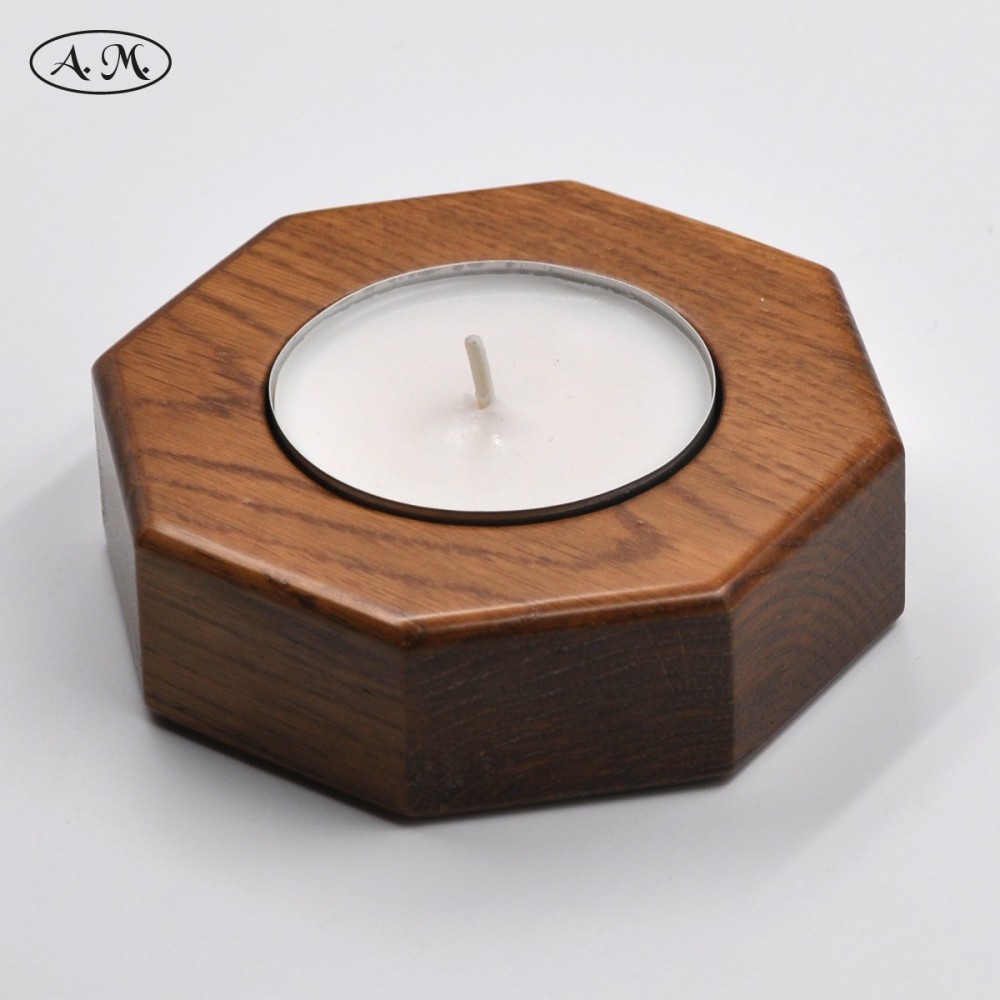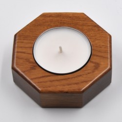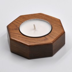 Portavelas con forma de octógono de 100mm de ancho. Fabricado en madera natural de roble teñida en color nogal.