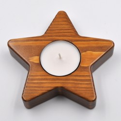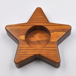 Portavelas con forma de estrella de 5 puntas de 150mm de ancho. Fabricado en madera natural de pino teñida en color nogal.