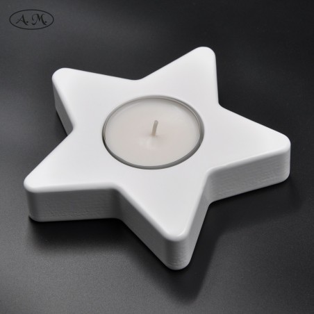 Portavelas con forma de estrella de 5 puntas de 150mm de ancho. Fabricado en tablero de fibras y con acabado lacado.