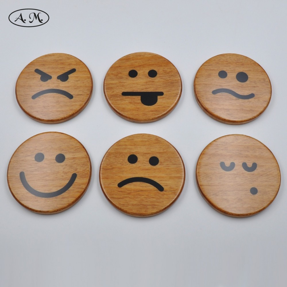 Posavasos de emoticonos, fabricados en madera natural de koto teñida en color nogal y resina epoxy.