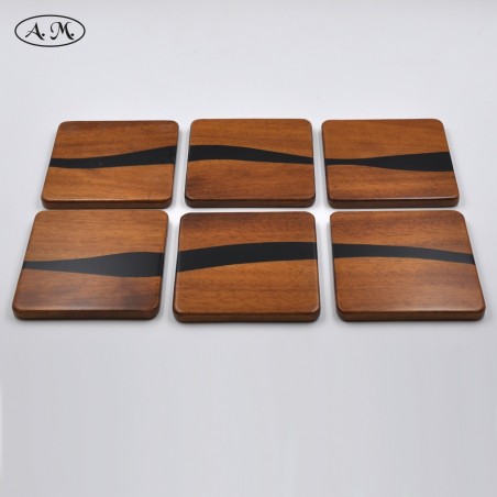 Posavasos fabricados artesanalmente de madera natural de iroko con relleno de resina epoxy y acabado con barniz de alta dureza. Diseño con efecto río en color negro.