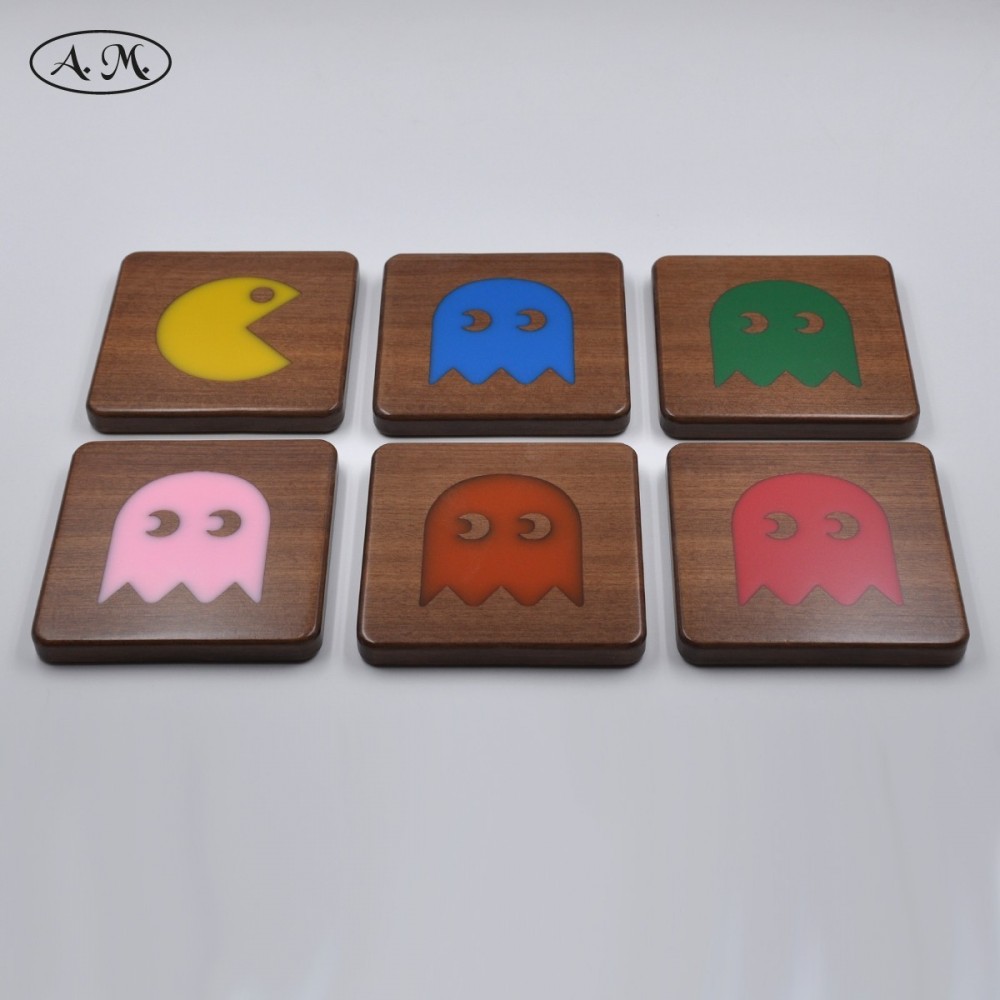 Posavasos fabricados artesanalmente de madera natural de mansonia con relleno de resina epoxy y acabado con barniz de alta dureza. Diseño de Pacman y los fantasmas.