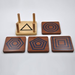 Posavasos de figuras geométricas, fabricados en madera natural de danta y resina epoxy.