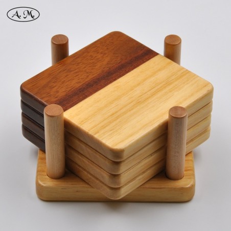 Posavasos fabricados artesanalmente de madera natural de iroko, sapelly. y koto, y acabado con barniz de alta dureza.