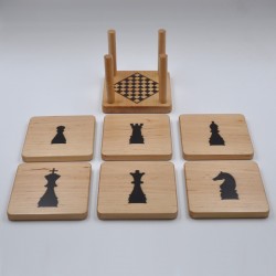 Posavasos de fichas de ajedrez negras, fabricados en madera natural de abedul y resina epoxy.