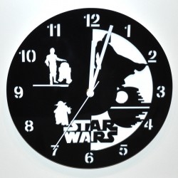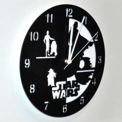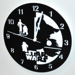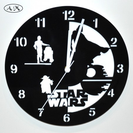 Reloj de pared fabricado a mano con metacrilato negro de 3 mm de grosor en la parte delantera, y metacrilato blanco de 2 mm de grosor en el fondo. Diseño inspirado en el universo de Star Wars.