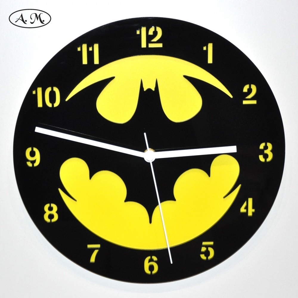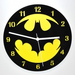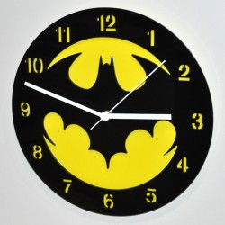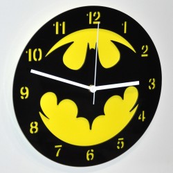 Reloj de pared fabricado a mano con metacrilato negro de 3 mm de grosor en la parte delantera, y polipropileno amarillo en el fondo. Diseño inspirado en Batman.