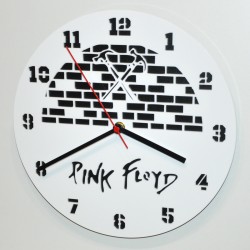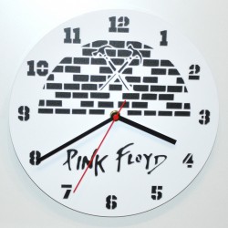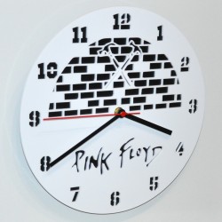 Reloj de pared fabricado a mano con metacrilato blanco de 3 mm de grosor en la parte delantera, y polipropileno negro en el fondo. Diseño inspirado en la popular portada del disco The Wall de Pink Floyd.