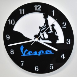 Reloj de pared fabricado a mano con metacrilato negro de 3 mm de grosor en la parte delantera, y metacrilato blanco de 2 mm de grosor en el fondo. Diseño inspirado en la marca de motocicletas Vespa.