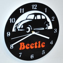 Reloj de pared fabricado a mano con metacrilato negro de 3 mm de grosor en la parte delantera, y metacrilato blanco de 2 mm de grosor en el fondo. Diseño inspirado en el icónico coche Beetle o "Escarabajo".