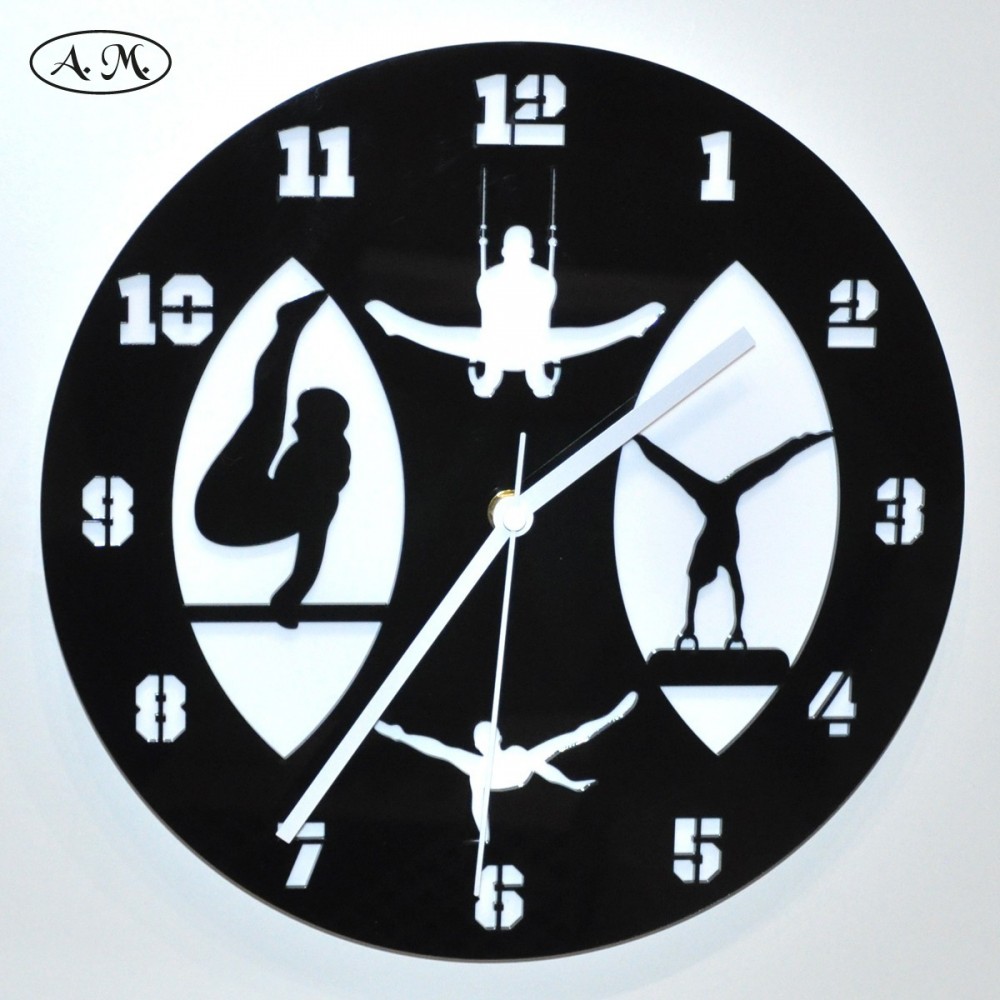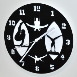 Reloj de pared fabricado a mano con metacrilato negro de 3 mm de grosor en la parte delantera, y metacrilato blanco de 2 mm de grosor en el fondo. Diseño inspirado en las pruebas de gimnasia artística.