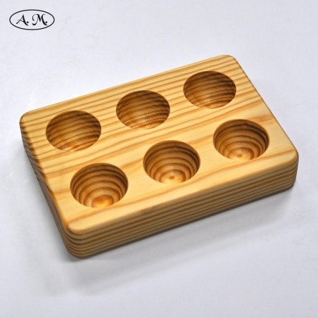 Tabla de cortar fabricada a mano con madera natural de pino. Diseño a favor de veta. Acabada con aceite mineral natural y nuestro preparado con cera de abeja. Por un lado es completamente lisa, y por el otro tiene seis cavidades para sujetar huevos.