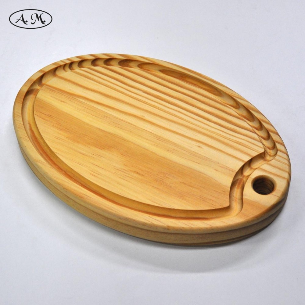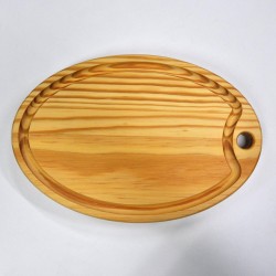 Tabla de cortar fabricada a mano con madera natural de pino. Diseño a favor de veta. Acabada con aceite mineral natural y nuestro preparado con cera de abeja. Por un lado es completamente lisa, y por el otro tiene una canal en todo el contorno para retener líquidos.