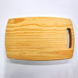 Tabla de cortar fabricada a mano con madera natural de pino. Diseño a favor de veta. Acabada con aceite mineral natural y nuestro preparado con cera de abeja. Completamente lisa por las dos caras.