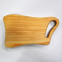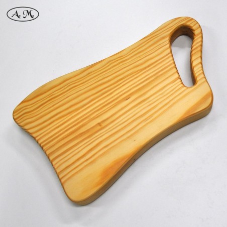 Tabla de cortar fabricada a mano con madera natural de pino. Diseño a favor de veta. Acabada con aceite mineral natural y nuestro preparado con cera de abeja. Completamente lisa por las dos caras.