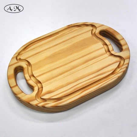 Tabla de cortar fabricada a mano con madera natural de pino. Diseño a favor de veta. Acabada con aceite mineral natural y nuestro preparado con cera de abeja. Por un lado es completamente lisa, y por el otro tiene una canal en todo el contorno para retener líquidos.