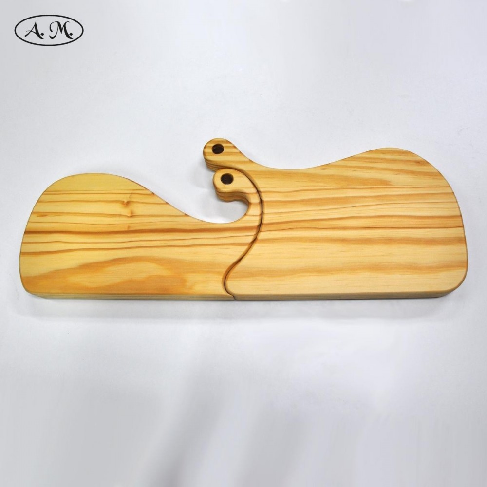 Tabla de cortar fabricada a mano con madera natural de pino. Diseño a favor de veta. Acabada con aceite mineral natural y nuestro preparado con cera de abeja. Completamente lisa por las dos caras.