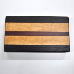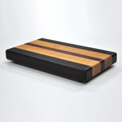 Tabla de cortar fabricada a mano con madera natural de wengué, arce y nazareno. Diseño a favor de veta. Acabada con aceite mineral natural y nuestro preparado con cera de abeja.