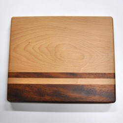 Tabla de cortar fabricada a mano con madera natural de haya e iroko. Diseño a favor de veta. Acabada con aceite mineral natural y nuestro preparado con cera de abeja.