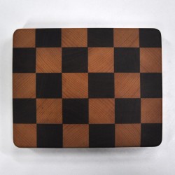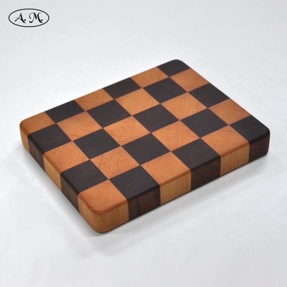 Tabla de cortar fabricada a mano con madera natural de haya y danta. Diseño a testa. Acabada con aceite mineral natural y nuestro preparado con cera de abeja.