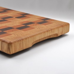Tabla de cortar fabricada a mano con madera natural de fresno, cerezo y mansonia. Diseño a testa. Acabada con aceite mineral natural y nuestro preparado con cera de abeja.