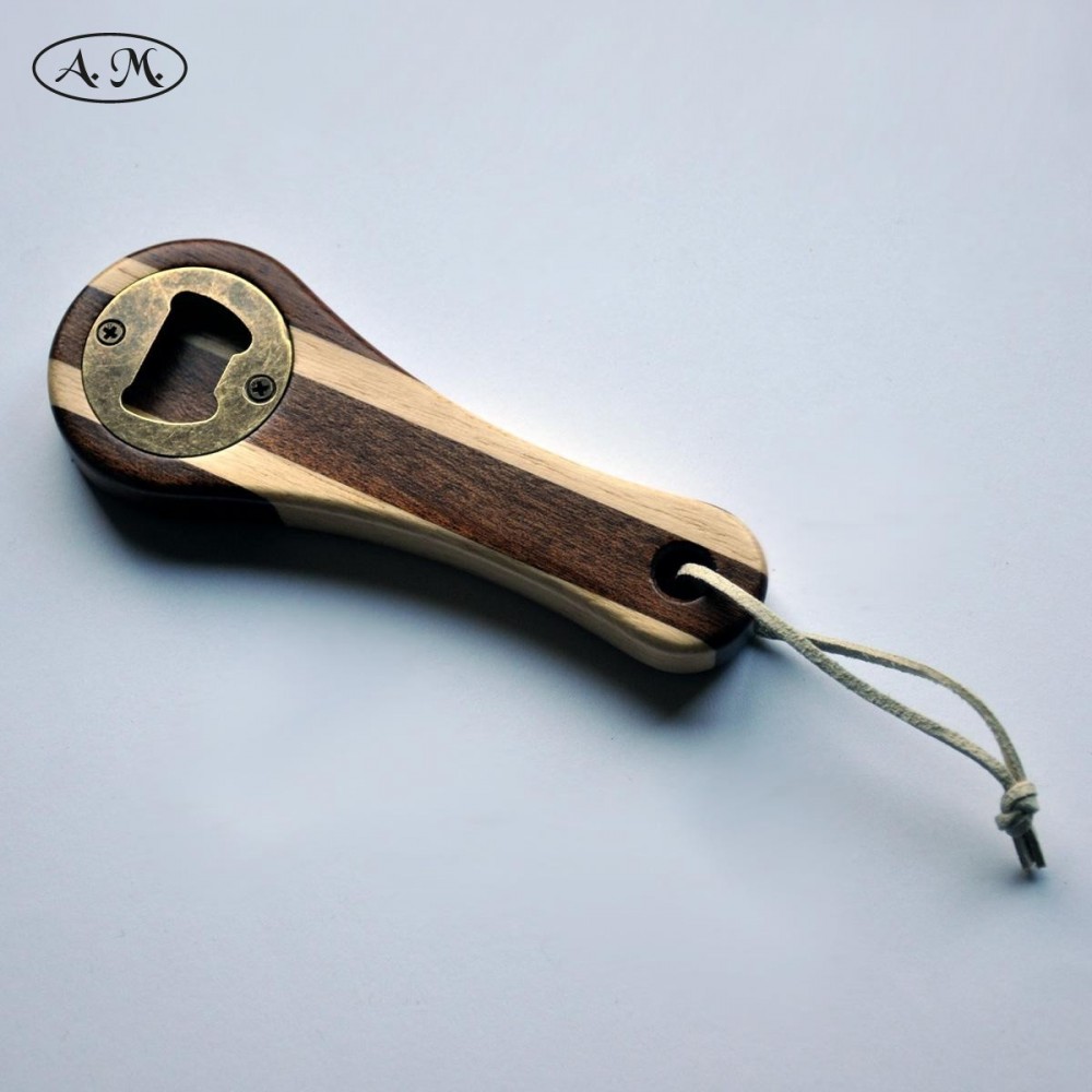Práctico abridor de mano para quitar la chapa de las botellas. Fabricado en madera natural de sapelly y koto.