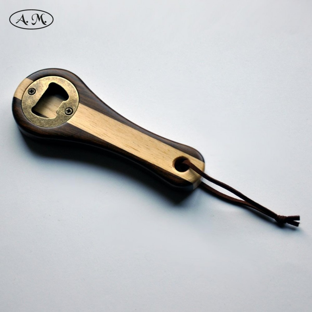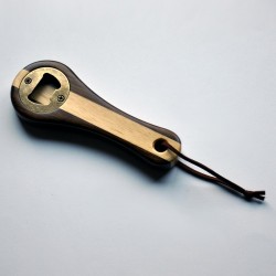 Práctico abridor de mano para quitar la chapa de las botellas. Fabricado en madera natural de mongoy y koto.