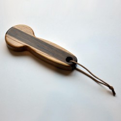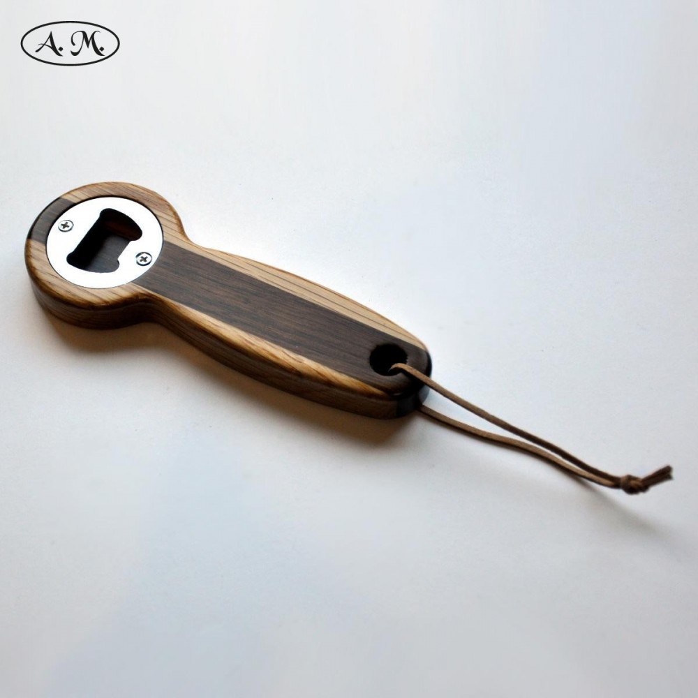 Práctico abridor de mano para quitar la chapa de las botellas. Fabricado en madera natural de mongoy y roble.