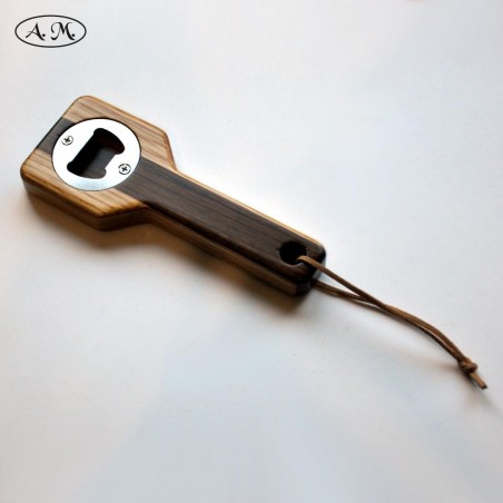 Práctico abridor de mano para quitar la chapa de las botellas. Fabricado en madera natural de mongoy y roble.