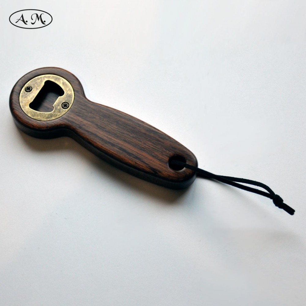 Práctico abridor de mano para quitar la chapa de las botellas. Fabricado en madera natural de sapelly.