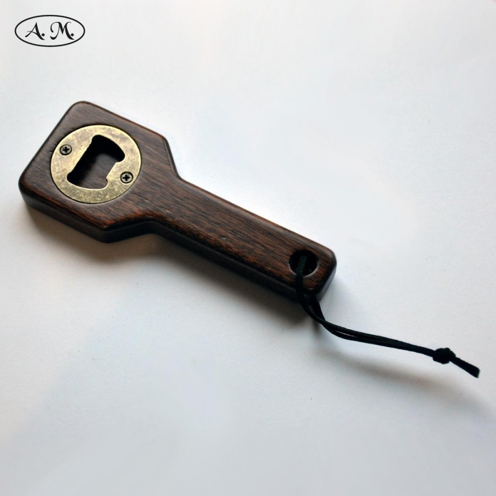 Práctico abridor de mano para quitar la chapa de las botellas. Fabricado en madera natural de sapelly.