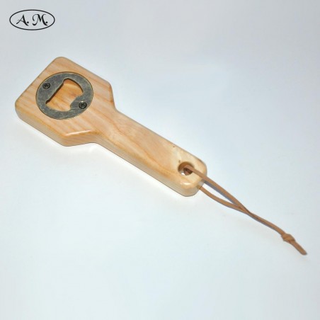 Práctico abridor de mano para quitar la chapa de las botellas. Fabricado en madera natural de fresno.